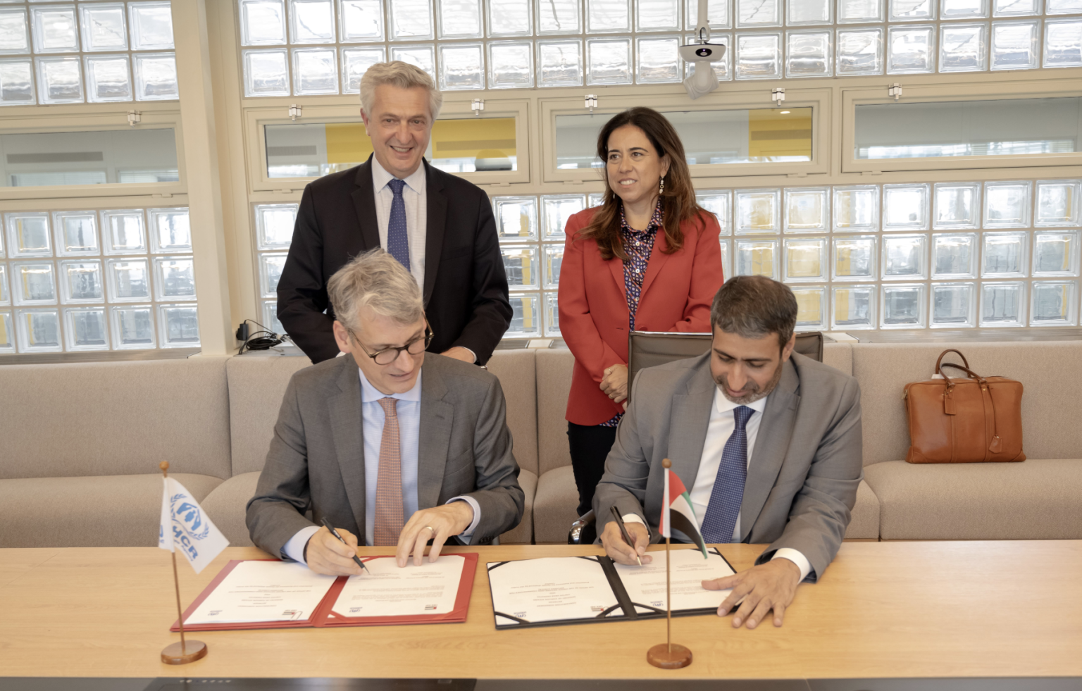 وقع الاتفاقية، من جانب دولة الإمارات سعادة سلطان الشامسي مساعد وزير الخارجية لشؤون التنمية والمنظمات الدولية، وعن المفوضية السامية للأمم المتحدة لشؤون اللاجئين مارك مانلي رئيس إدارة علاقات المانحين وحشد الموارد، وبحضور معالي لانا زكي نسيبة، مساعدة وزير الخارجية للشؤون السياسية، وسعادة فيليبو غراندي المفوض السامي لشؤون اللاجئين، وذلك في مقر المفوضية في جنيف.