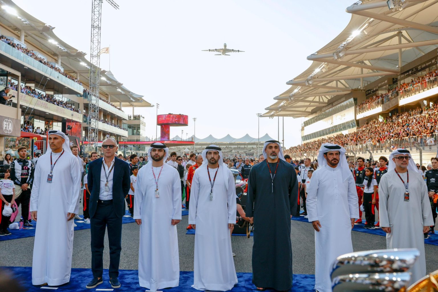 وأعطى سموّ الشيخ خالد بن محمد بن زايد آل نهيان، يرافقه سمو الشيخ حمدان بن محمد بن راشد آل مكتوم .. إشارة الانطلاق الرسمي للسباق معلناً بداية الجولة الختامية من بطولة العالم للفورمولا 1، بعد عزف السلام الوطني لدولة الإمارات العربية المتحدة.