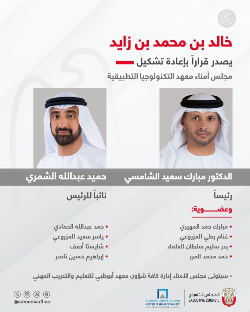 أصدر سموّ الشيخ خالد بن محمد بن زايد آل نهيان، ولي عهد أبوظبي رئيس المجلس التنفيذي لإمارة أبوظبي، قراراً بإعادة تشكيل مجلس أمناء معهد التكنولوجيا التطبيقية، برئاسة سعادة الدكتور مبارك سعيد الشامسي، وسعادة حميد عبدالله الشمري، نائباً الرئيس.
