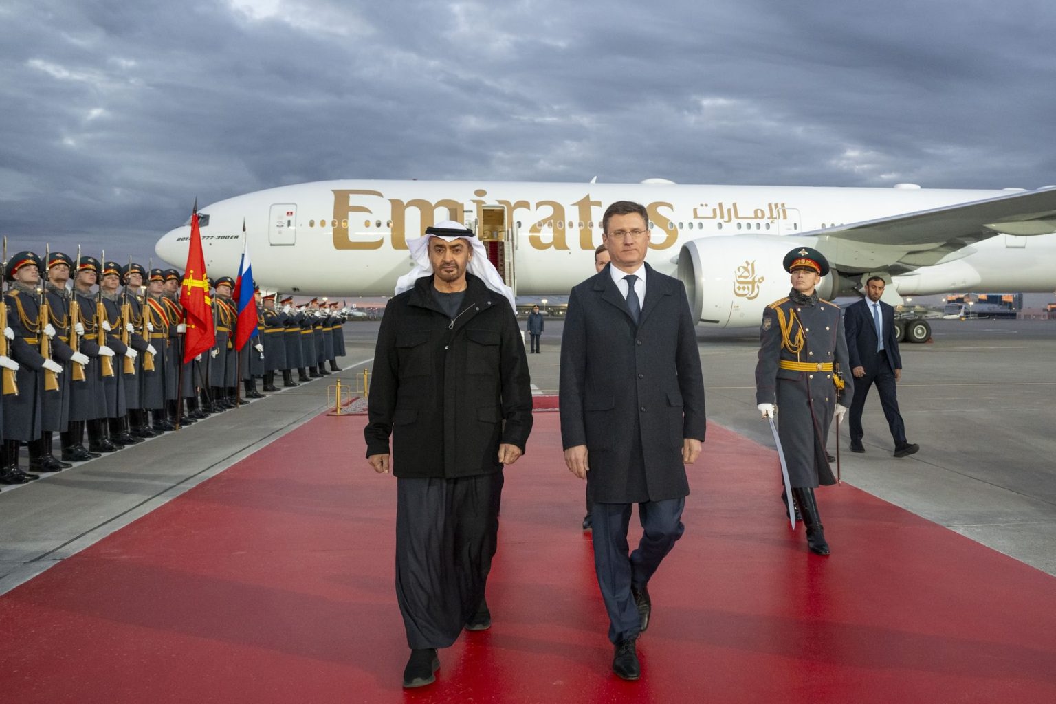 ويضم الوفد المرافق لصاحب السمو رئيس الدولة خلال الزيارة.. سمو الشيخ عبد الله بن زايد آل نهيان نائب رئيس مجلس الوزراء وزير الخارجية وسمو الشيخ حمدان بن محمد بن زايد آل نهيان نائب رئيس ديوان الرئاسة للشؤون الخاصة ومعالي الشيخ محمد بن حمد بن طحنون آل نهيان مستشار الشؤون الخاصة في ديوان الرئاسة ومعالي علي بن حماد الشامسي الأمين العام للمجلس الأعلى للأمن الوطني ومعالي الدكتور سلطان بن أحمد سلطان الجابر وزير الصناعة والتكنولوجيا المتقدمة ومعالي الدكتور ثاني بن أحمد الزيودي وزير دولة للتجارة الخارجية ومعالي أحمد بن علي الصايغ وزير دولة ومعالي فيصل عبد العزيز البناي مستشار رئيس الدولة لشؤون الأبحاث الإستراتيجية والتكنولوجيا المتقدمة ومعالي خلدون خليفة المبارك رئيس جهاز الشؤون التنفيذية وسعادة محمد العبار رئيس مجلس إدارة شركة إيجل هيلز وسعادة محمد الجابر سفير الدولة لدى روسيا الاتحادية.