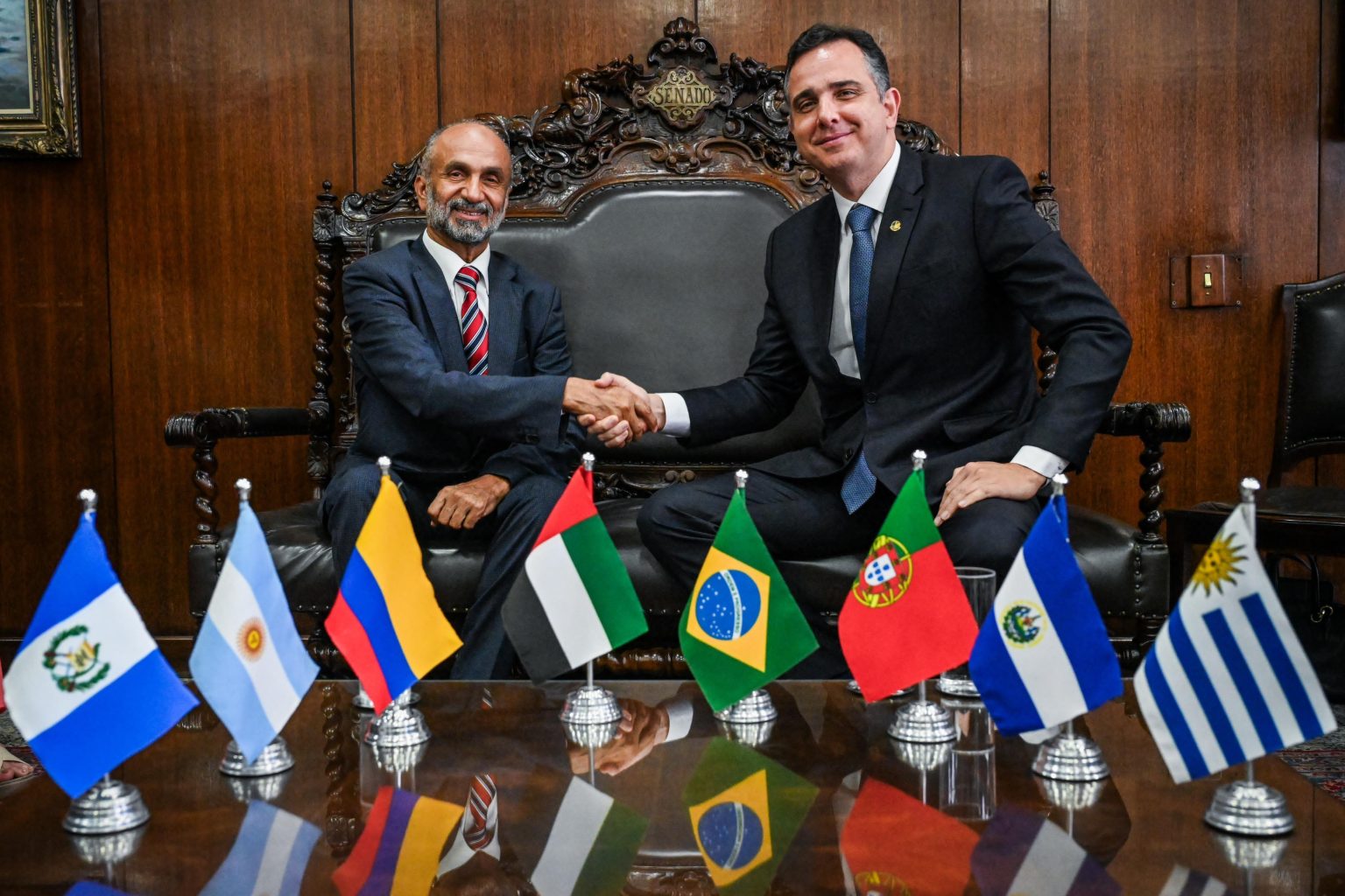من جانبه شكر معالي الجروان .. رئيس مجلس الشيوخ البرازيلي على حسن الاستقبال والضيافة التي حظي بها المجلس في البرازيل، والدعم الكبير لتوجهات المجلس، مؤكداً أهمية العمل والتعاون لما فيه مصلحة وخير التسامح والسلام في العالم.