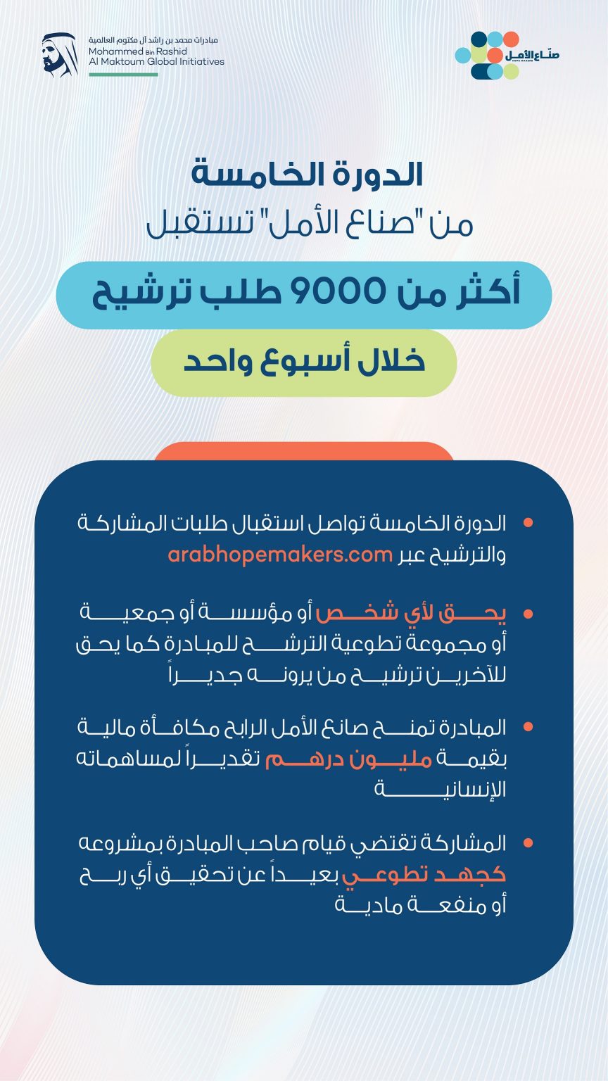 سجلت مبادرة “صناع الأمل”، إقبالاً كبيراً على المشاركة من مختلف أنحاء الوطن العربي؛ إذ استقبلت أكثر من 9000 طلب ترشيح بعد مرور أسبوع واحد على إعلان صاحب السمو الشيخ محمد بن راشد آل مكتوم، نائب رئيس الدولة رئيس مجلس الوزراء حاكم دبي، رعاه الله، البحث عن صناع الأمل في العالم العربي للعام 2024، مع انطلاق الدورة الخامسة من المبادرة.