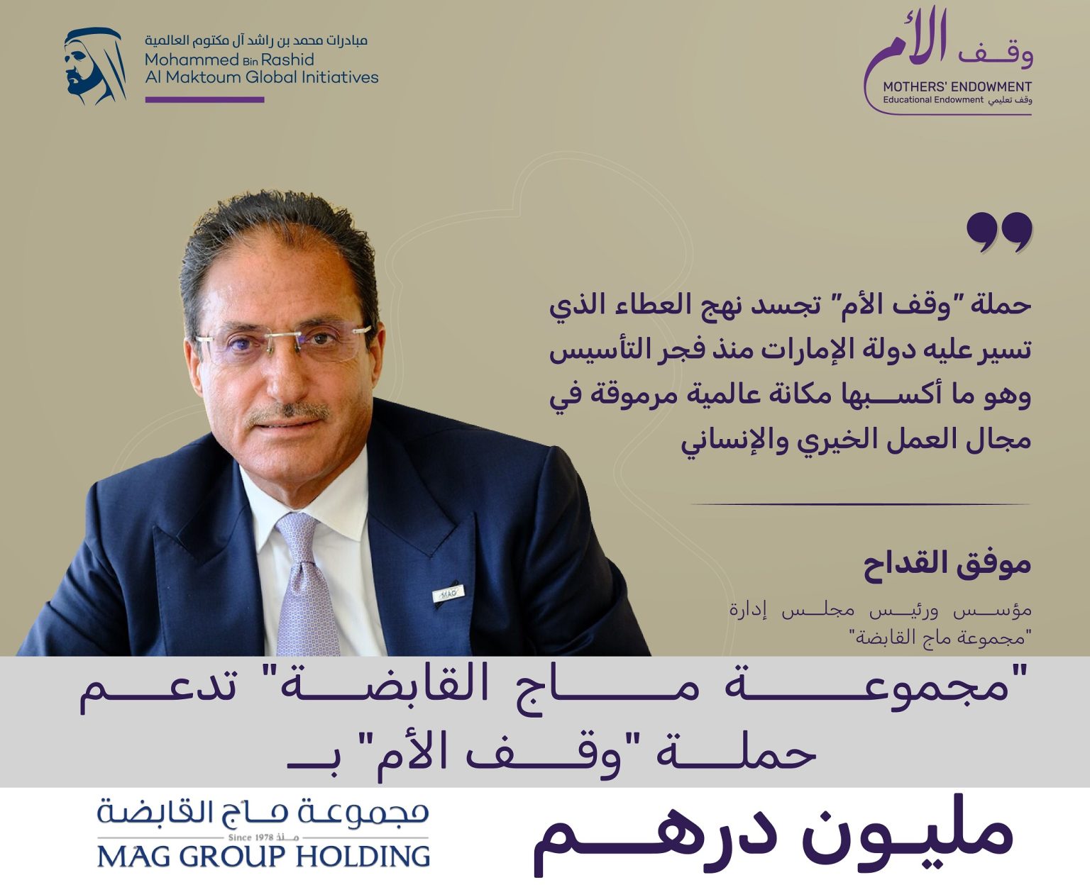 أعلنت “مجموعة ماج القابضة”، ذات الأنشطة التجارية المتنوعة في مجال التطوير العقاري والهندسة والمقاولات والصناعة والتجارة والشحن والخدمات والضيافة، عن تبرعها بمبلغ مليون درهم لدعم حملة “وقف الأم” التي أطلقها صاحب السمو الشيخ محمد بن راشد آل مكتوم نائب رئيس الدولة رئيس مجلس الوزراء حاكم دبي “رعاه الله”، بالتزامن مع شهر رمضان الفضيل لتكريم الأمهات بإنشاء صندوق وقفي بقيمة مليار درهم لدعم تعليم ملايين الأفراد حول العالم بشكل مستدام.