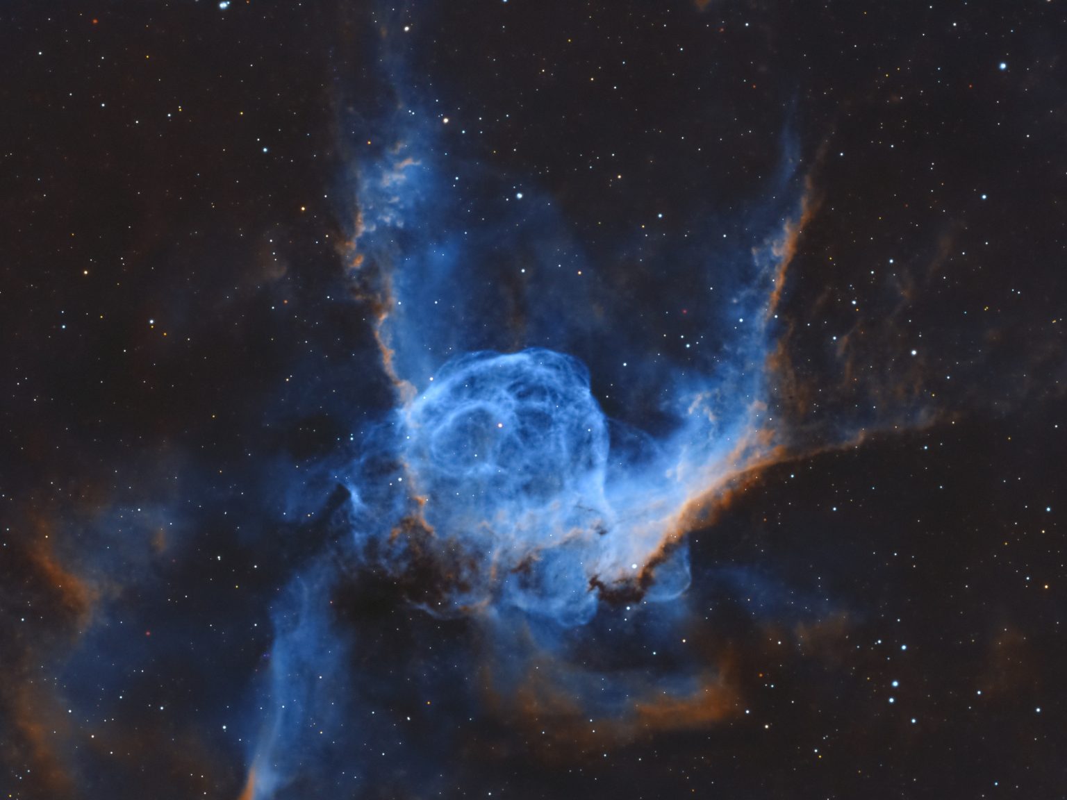 وتم التقاط الصورة من مرصد الختم الفلكي في صحراء أبوظبي باستخدام تلسكوب قطره 14 إنش وباستخدام مرشحات الهيدروجين “اللون الأخضر” والأوكسجين “اللون الأزرق” والكبريت “اللون الأحمر” وبلغت عدد الصور 276 صورة بواقع 3 دقائق لكل صورة أي أن مدة تعريض الصورة بلغت حوالي 14 ساعة.