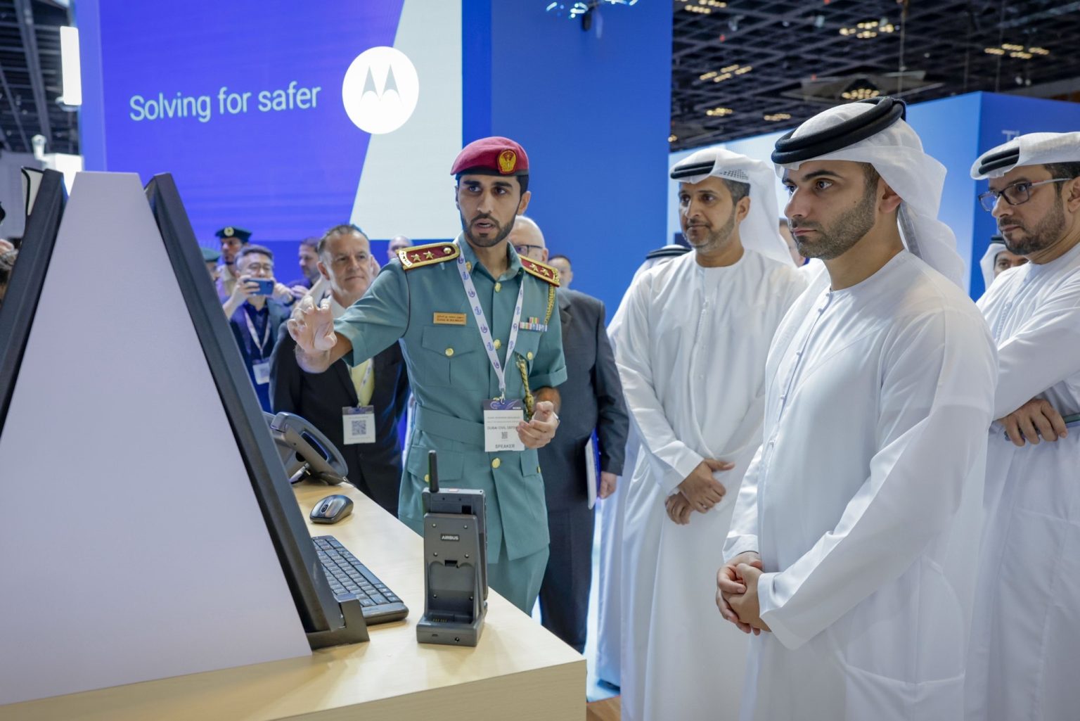 “كما اطلع سموه خلال زيارته لجناح شركة “موتورولا سوليوشنز” في المعرض على أحدث ابتكارات الشركة في مجال الموجات الراديوية لأنظمة الاتصالات الرقمية “تيترا” وأنظمة المراقبة بالفيديو والتحكم في الوصول، إضافة إلى تقنيات مركز التحكم التي تجمع المعلومات الحيوية في واجهة عرض موحدة، واستمع سموه لشرح حول دور التقنيات المتطورة في تمكين المستخدمين من الاستجابة على نحو أكثر فعالية وكفاءة، وكيف يمكن للذكاء الاصطناعي وتحليلات الفيديو المساهمة في مساعدة وتسريع عملية اتخاذ القرارات من جانب الفرق المختصة”.