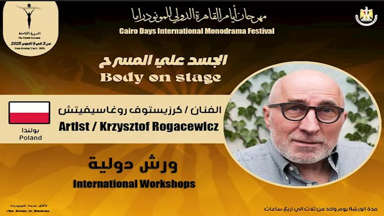 أما على مسرح مركز الهناجر للفنون، وبإشراف الفنان شادي سرور، فتقام الورشة الثالثة بالمهرجان بعنوان «الجسد على المسرح» للفنان البولندي كرزيستوف روغاسيفيتش، في تمام الواحدة ظهرًا، وتتناول أساليب التعبير الجسدي في الأداء المسرحي المعاصر.