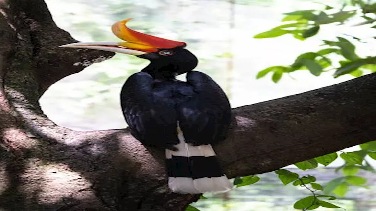 من الطيور الكبيرة والأكثر وضوحًا في آسيا الاستوائية، ويُعرف بقرنه البارز على المنقار، بينما ريش هذا الطائر أسود لامع، مع ذيل أبيض مع شريط أسود، وأرجل بيضاء.
