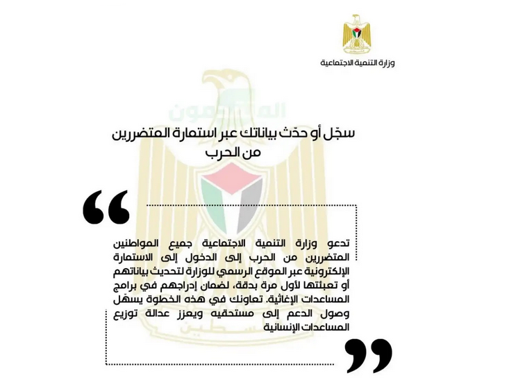 وتؤكد وزارة التنمية الاجتماعية أن هذه الخطوة تأتي في إطار تعزيز الشفافية وتنظيم عملية توزيع المساعدات، بما يضمن العدالة في الوصول إلى الفئات الأكثر تضررًا من الحرب والأوضاع الاقتصادية الصعبة.