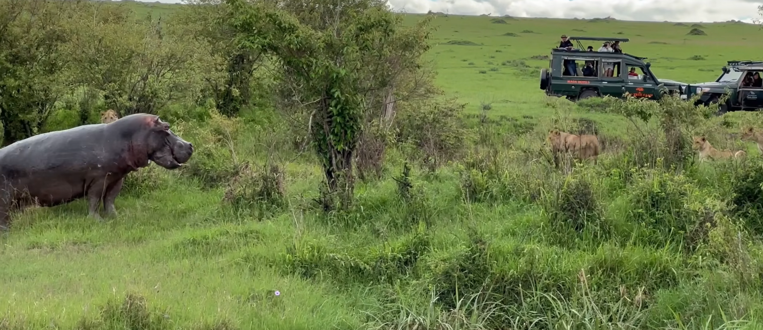 وأظهرت اللقطات مجموعة أسود تحاول التسلل إلى منطقة فرس النهر العملاق الذي انتفض بشكل مفاجئ ودفعهم للخوف والهرب منه.