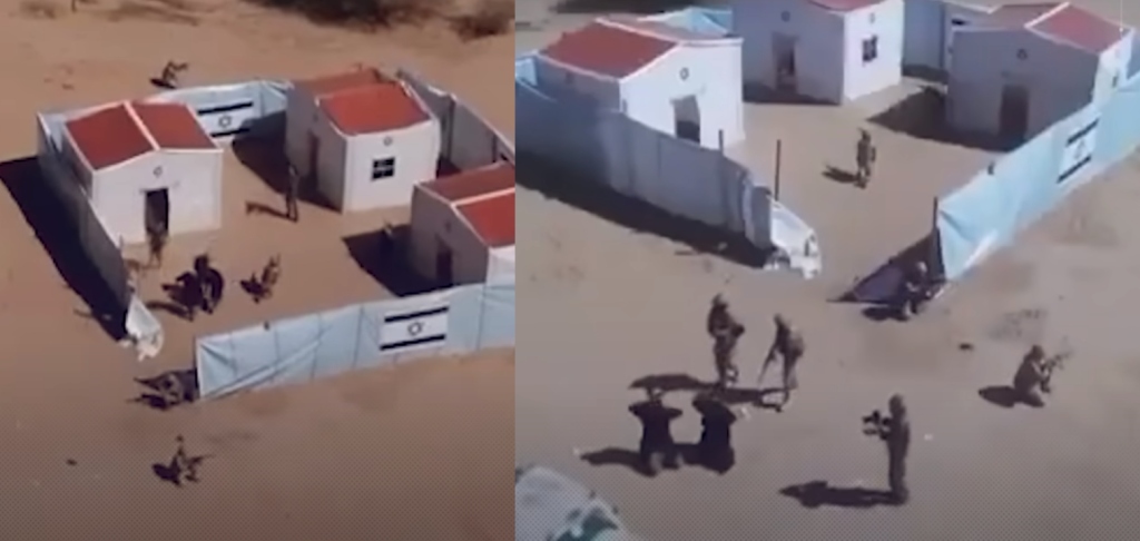 وبدا في مشهد تالِ التقط من طائرة مسيرة مجسم مستوطنة أخرى وعدد من العناصر يقومون باقتحام منازلها.