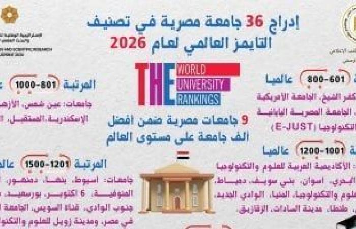 وأشار المتحدث الرسمي إلى أن الجامعات المصرية كانت قد تواجدت في تصنيف التايمز عام 2016 بنحو 3 جامعات فقط، ثم ارتفع العدد إلى 8 جامعات عام 2017، و19 جامعة عام 2019، و28 جامعة عام 2024، ثم 35 جامعة في 2025، وصولًا إلى 36 جامعة في نسخة عام 2026، وهو ما يُعد أكبر حضور للجامعات المصرية في هذا التصنيف منذ انضمامها إليه.