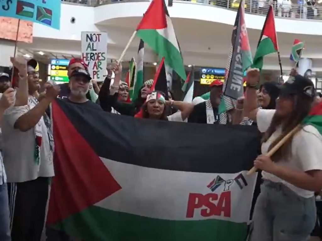 والتُقطت هذه المشاهد من مطار أو آر تامبو الدولي في جوهانسبرغ، ووثقت حالة الاحتفاء بالمحامي نكوكايتوبي، حيث تجمع العشرات من الأشخاص وهم يحملون أعلام فلسطين.