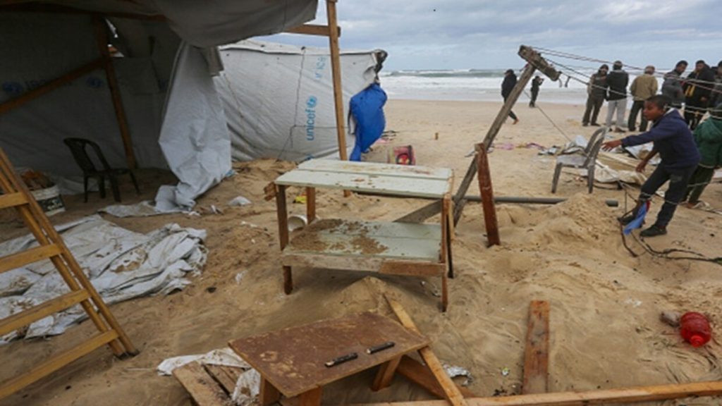 وعلى شاطئ البحر حيث لجأ النازحون هربا من الإبادة الإسرائيلية المستمرة، حدثت الكارثة باجتياح مياه البحر الخيام المهترئة التي لا تكاد تحمي قاطنيها من برودة الطقس، ليتدمر ما تبقى من مقومات حياتهم وتزيد معاناتهم.
