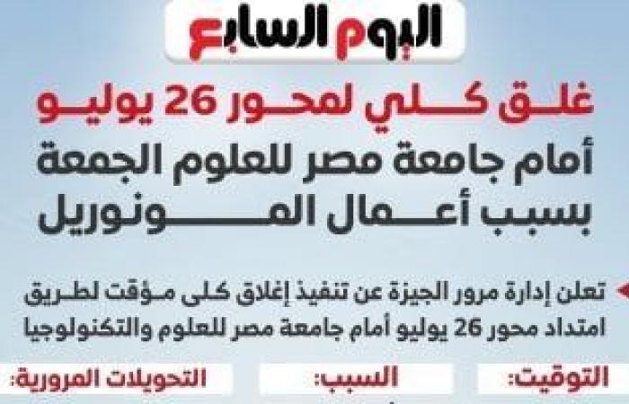 تنفذ الإدارة العامة لمرور الجيزة إغلاقا كليا مؤقتا لطريق امتداد محور 26 يوليو أمام جامعة مصر للعلوم والتكنولوجيا، وذلك يوم الجمعة الموافق 24 أكتوبر 2025، من الساعة الثالثة فجرًا حتى التاسعة صباحًا، بهدف تنفيذ أعمال إنشائية ضمن مشروع مونوريل وادي النيل – 6 أكتوبر، والمتعلقة برفع كوبري المشاة الخاص بمحطة مونوريل جامعة النيل.