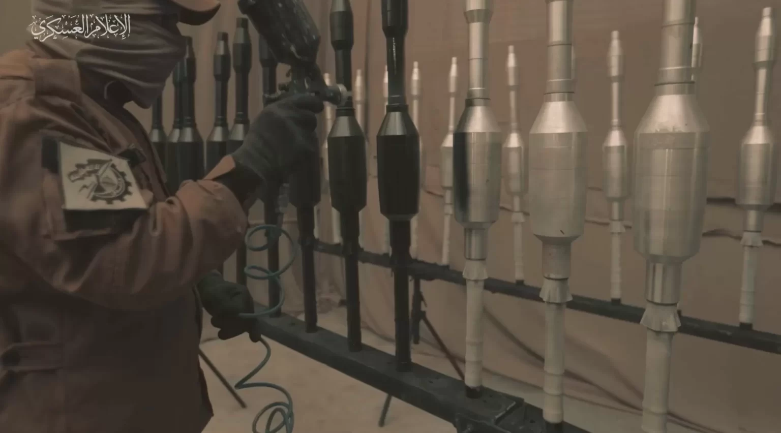 وبدا أحد العناصر وهو يقوم بدهنها باللون الأسود وبدت على جانبها عبارة قذيفة الياسين المضادة للدروع عيار 105 ملم.