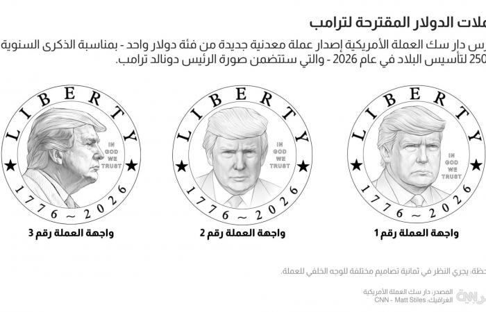 وأصدرت دار سك العملة الأمريكية، الخميس، ثلاثة تصاميم مقترحة لعملات معدنية تحمل صورًا مختلفة لترامب، من بينها تصميم يُشبه صورته الشهيرة من عام 2023. وتتضمن تصاميم الوجه الخلفي للعملة نسخًا مختلفة من النسر الأمريكي.