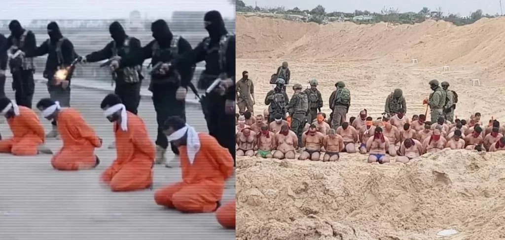 ونشر الرواد صورتين الأولى من غزة لما فعله جنود الاحتلال من إجرام وحشي بحق المعتقلين الذين جردتهم من ملابسهم في ظل الأجواء الشتوية الباردة وقامت بتعذيبهم، وأخرى سابقة للحظة إعدام عناصر تنظيم داعش لمعتقلين لديها، حيث تتشابه الصورتين.