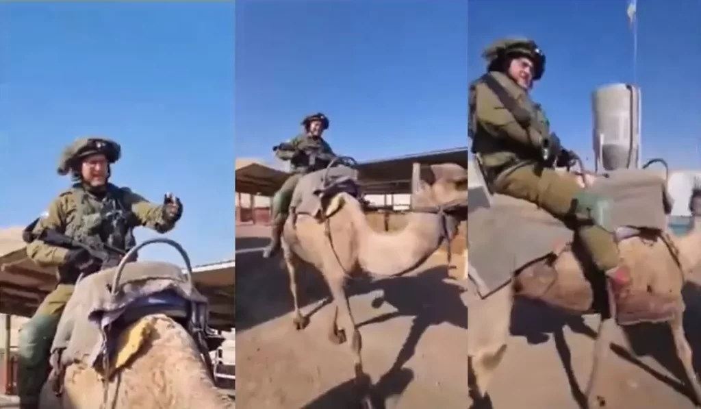 وتداول مستخدمو منصات التواصل مقطع فيديو لجندي إسرائيلي يسرق جمل مواطن فلسطيني بقطاع غزة، ويلتقط الصور وهو يركبه متفاخرًا وفرحا بفعلته.