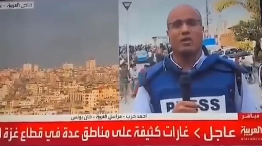 وكان المراسل أحمد حرب، يتحدث عن الوضع الأمني في منطقة “دقة” في بني سهيلا شرق مدينة خان يونس، حيث سقط 11 شهيداً حتى هذه اللحظة كما قال قبل أن يستدرك أحد عشر ضحية وعشرات الإصابات.