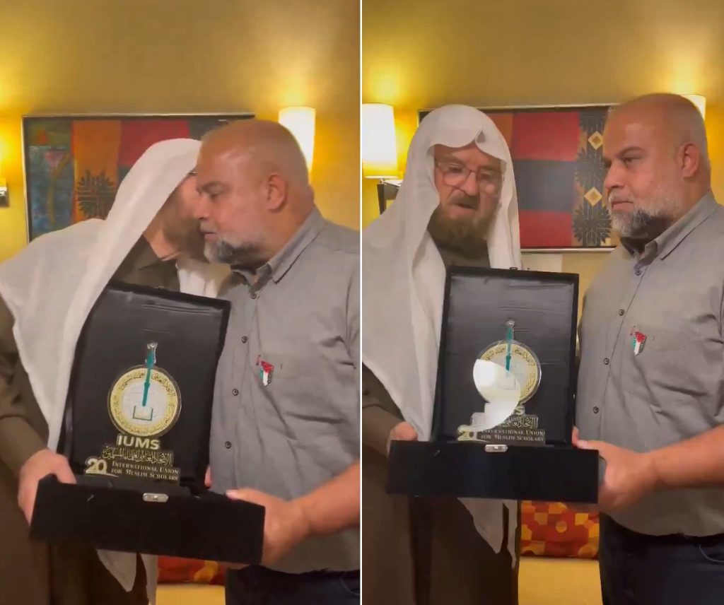 وأضاف: “لقد قمت بتقديم درع الاتحاد العالمي لعلماء المسلمين ل أ. وائل دحدوح كتكريم وتقدير لجهوده النبيلة في الإعلام، وكذلك كدعم وتشجيع لكل الإعلاميين الذين يعملون بصدق وإخلاص. والله أسأل أن تكون هذه الزيارة بمنزلة الدافع الإضافي لكل من يعمل في مجال الإعلام للالتزام بالصدق والمبادئ الأخلاقية في عملهم”.