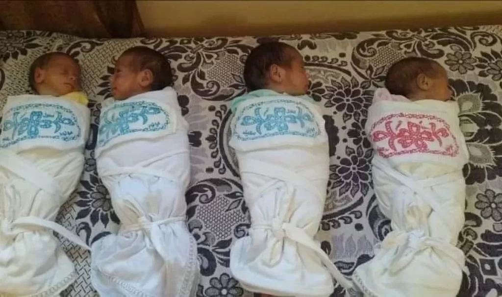 وفوق سريرهم الذي أعدته والدتهم بعناية فائقة، يرقد المواليد الأربعة رفقة والدتهم غرقى في دمائهم، بعد أن استهدفتهم طائرات الاحتلال الإسرائيلي بغارة عنيفة، قبل أن تتمكن والدتهم من إرضاعهم للمرة الأخيرة.