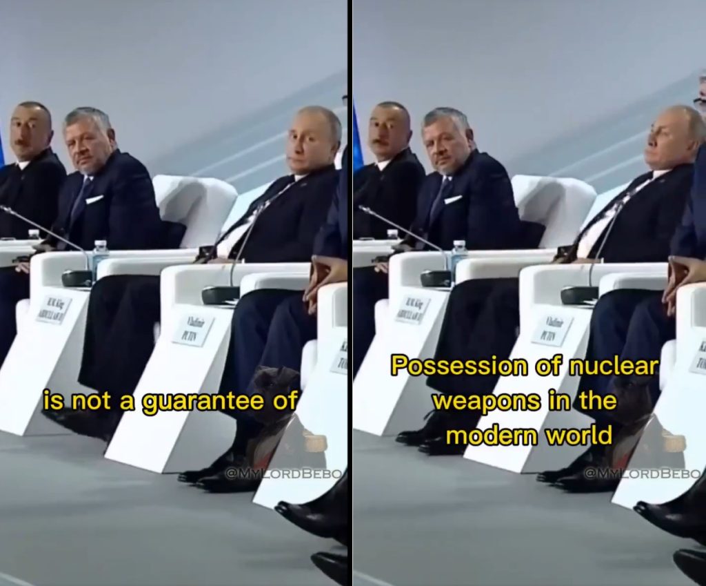 وكانت كلمة بوتين التي أعاد تداولها رواد منصات التواصل خلال جلسة مؤتمر “فالداي” في مدينة سوتشي الروسية عام 2019، حينما علق مازحا على كلمة الرئيس الكازاخي قاسم دجومارت توكاييف الذي أشار إلى أهمية أن تركز الدول على إقامة علاقات تيدة مع بعضها بدلا من السعي لامتلاك أسلحة نووية.