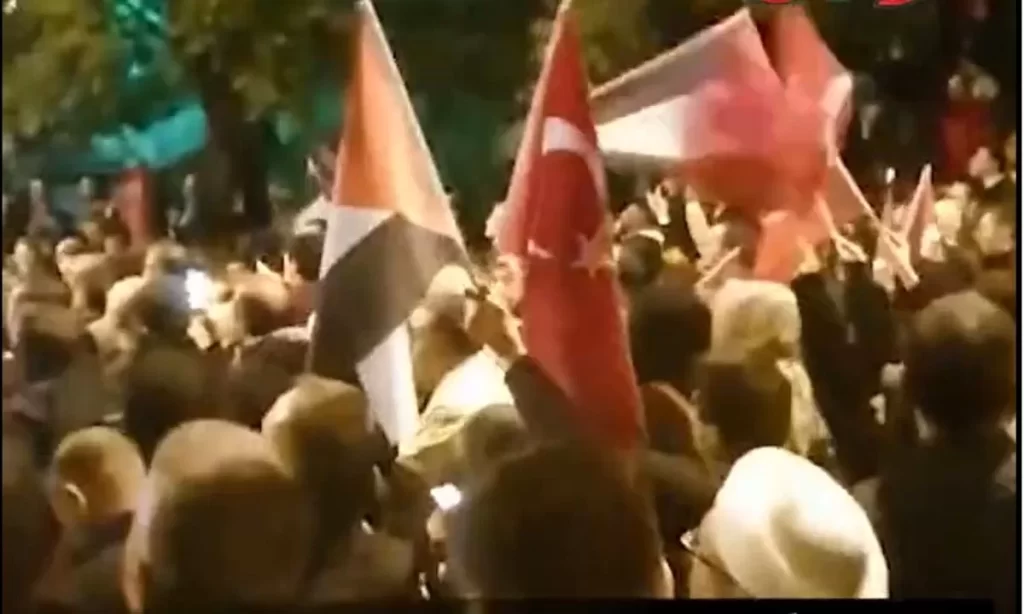 ويأتي ذلك بالتزامن مع انتشار مقاطع توثق تواجد تظاهرات غاضبة لعرب وأتراك أمام مقر السفارة الإسرائيلية في أنقرة، ومحاصرة المتظاهرين للسفارة.