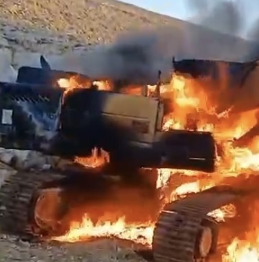 وأفادت مصادر محلية، بأن مستوطنين تسللوا إلى منطقة المصايات شمال البلدة، وأحرقوا “كرفانا”، وجرافة، وخطوا شعارات عنصرية.