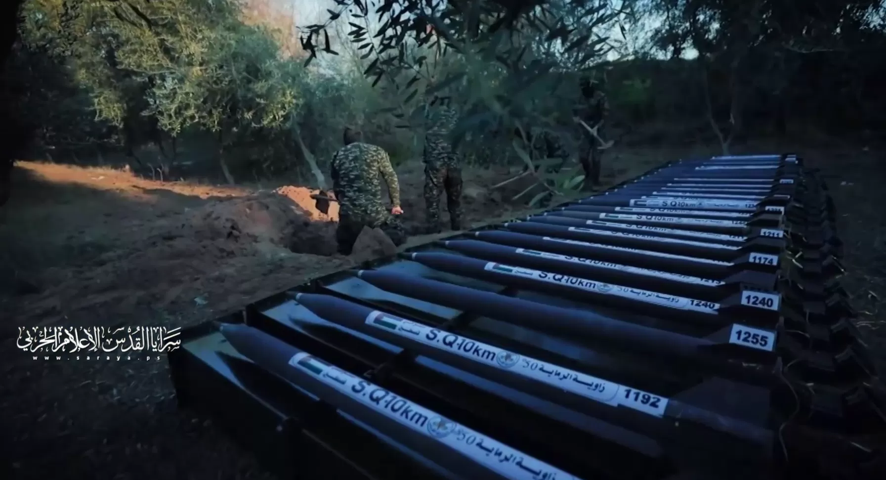 فيما يشاهد عناصر من سرايا القدس وهم يحفرون خنادق ترابية لوضع منصات الإطلاق، ثم يقومون بوضع الصواريخ التي بدا علم فلسطين عليها، ويتم ترتيب إجراءات الإطلاق باتجاه تل أبيب وغلاف غزة.