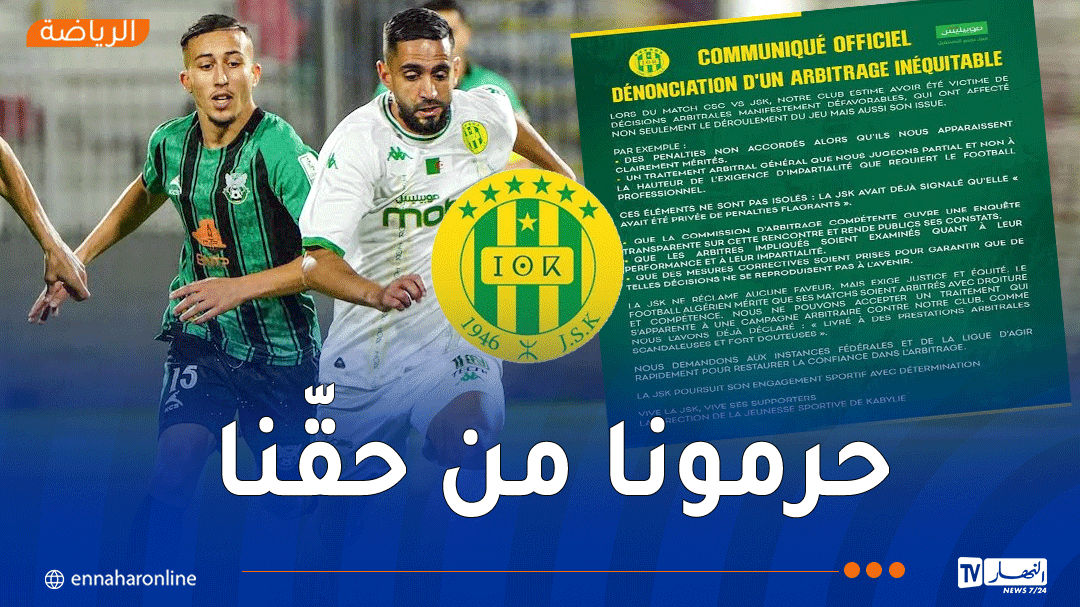 أصدرت إدارة شبيبة القبائل بياناً رسمياً عقب المباراة التي جمعت الفريق بشباب قسنطينة، اليوم الأحد، ضمن الجولة الـ11 من الرابطة المحترفة، وانتهت بفوز النادي القسنطيني بهدف دون رد بملعب الشهيد محمد حملاوي.