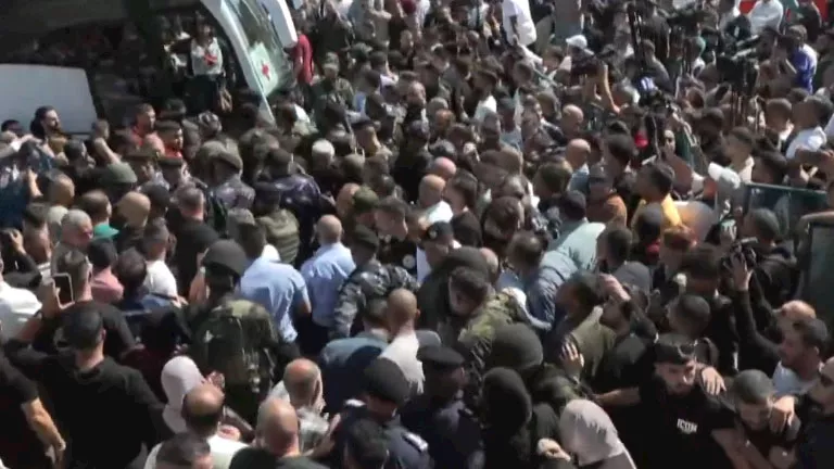 وتوافد حشود من المواطنين على الحافلات التي تقل مئات المعتقلين الفلسطينيين إلى غزة وإلى رام الله بالضفة الغربية بعد الإفراج عنهم من السجون الإسرائيلية اليوم الاثنين.