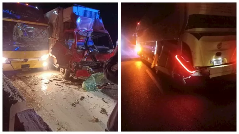 وانتقلت الجهات الأمنية لموقع الحادث، وأفادت المعاينة أن الحادث وقع نتيجة تصادم أتوبيس يحمل لوحات رقم “د ع ب 1543” مع أتوبيس رقم “د ع ب 3895” وسيارة نقل جامبو تلاجه رقم “د ن 4547” وسيارة نقل جامبو محملة دواجن.