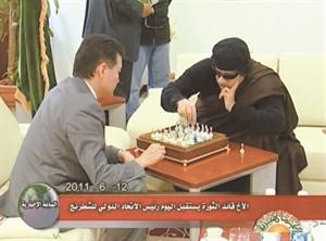 عواصم ـ وكالات: رغم تزايد عزلته الدولية وتزايد المعترفين بالمجلس الوطني الانتقالي الليبي وليس آخرهم المانيا والإمارات، ورغم استمرار غارات حلف شمال الأطلسي (الناتو) على مراكز قيادته، ظهر الزعيم الليبي معمر القذافي على التلفزيون الرسمي وهو يخوض مباراة في الشطرنج مع رئيس الاتحاد الدولي للعبة الروسي كيرسان إيليومجينوف في محاولة لإظهار تحديه ولامبالاته بالمجتمع الدولي الذي يضيق الخناق عليه يوما بعد يوم، وقد أكد إيليومجينوف ان المباراة جرت في أحد المباني الرسمية وليس في نفق أو موقع محصن، بعدما أعلن ان العقيد يختبئ في أنفاق محصنة عمقها 180 مترا.