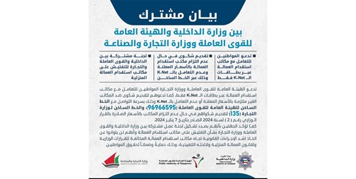 دعت الهيئة العامة للقوى العاملة ووزارة التجارة المواطنين للتعامل مع مكاتب استقدام العمالة عبر بطاقات الـ KNet فقط، كما دعتهم إلى تقديم شكوى ضد المكاتب غير الملتزمة بالأسعار المعلنة أو عدم التعامل بالـ KNet وذلك بسرعة التواصل مع الخط المباشر للهيئة العامة للقوى العاملة 96966595، والخط المباشر لوزارة التجارة 135 لتقديم شكواهم في حال عدم التزام المكاتب بالأسعار الصادرة بالقرار الوزاري رقم 2 لسنة 2024 الصادر بتاريخ 7 يناير 2024.