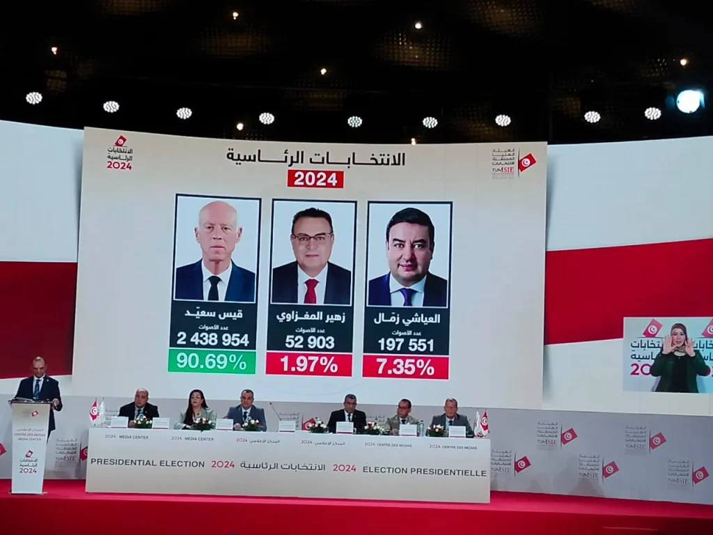 أعلنت هيئة الانتخابات التونسية رسميا فوز الرئيس قيس سعيد بالانتخابات الرئاسية التي جرت أمس الأحد، بعد حصوله على نسبة 90.6 في المائة. وتلي رئيس الهيئة العليا للانتخابات فاروق بوعسكر في مؤتمر صحفي النتائج الرسمية الأولية للانتخابات الرئاسية التي أظهرت حصول الرئيس سعيد على أكثر من 2.3 مليون صوت، ما يعادل 90.6 في المائة. وكشفت النتائج عن حصول المرشح الثاني العياشي زمال على نسبة7.59 في المائة، ما يمثل 179 ألف صوت. فيما حل زهير المغزاوي ثالثا بنسبة 1.9 في المائة، بمجموع 59 ألف صوت. وأكد بوعسكر أن نسبة التصويت في الانتخابات الرئاسية بلغت في 28.8 في المائة، حيث صوت 2.8 مليون ناخب، بينها أكثر من 200 ألف ورقة ملغاة، من مجموع 9.7 مليون ناخب مسجلين في القائمة الانتخابية.