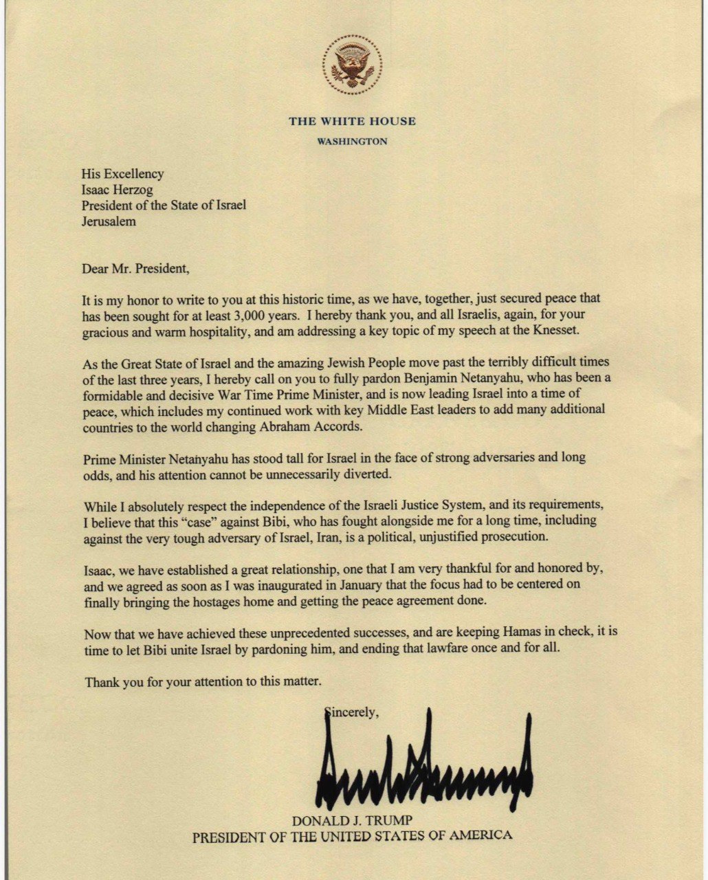 في الوقت الذي تتجاوز فيه دولة إسرائيل العظيمة والشعب اليهودي الرائع الأوقات الصعبة للغاية التي مرت بها خلال السنوات الثلاث الماضية، أدعوكم إلى العفو الكامل عن بنيامين نتنياهو، الذي كان رئيس وزراء قويًا وحاسمًا في زمن الحرب، ويقود إسرائيل الآن إلى زمن السلام، والذي يتضمن عملي المستمر مع قادة الشرق الأوسط البارزين لإضافة العديد من الدول إلى اتفاقيات أبراهام التي غيرت العالم.