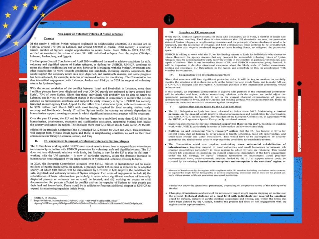 أمد/ لندن: تداول مسؤولون غربيون وعرب، وثيقتين سريتين تتعلقان بسوريا حصلت “المجلة” على نصهما، الأولى أوروبية تتعلق بـ “العودة الطوعية للاجئين السوريين” وتقترح خطوات ملموسة بينها تعيين مبعوث أوروبي للانخراط مع دمشق ومؤسسات أممية للبناء على موضوع اللاجئين، وأحد المرشحين لهذا المنصب كريستيان بيرغر، والمشاركة في “إعادة تأهيل البنية التحتية” و”الحوار التقني على المستوى المحلي مع الأفراد غير المشمولين بالعقوبات” الأوروبية. حسب مجلة المجلة.