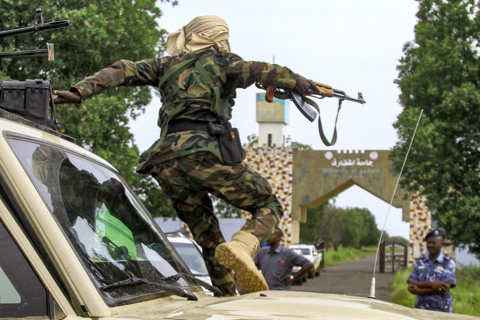 TOPSHOT A fighter jumps off a vehicle moving in a military convoy accompanying the governor of Sudan’s Darfur State during a stopover at Gedaref University in the eastern city of Gedaref while on the way to Port Sudan on August 30, 2023. (Photo by AFP) (Photo by /AFP via Getty Images)
