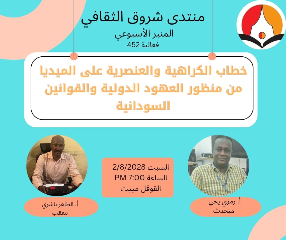 نظم منتدى شروق الثقافي إسفيريا السبت الماضي منبره الأسبوعي الذي جاء تحت عنوان (خطاب الكراهية والعنصرية علي الميديا من منظور العهود الدولية والقوانين السودانية). وقال المتحدث الرئيس الأستاذ رمزي يحيى المحامي ليس هناك تعريف جامع لخطاب الكراهية بسبب الاختلافات الثقافية بين دول العالم. ولكن خطاب الكراهية يتضمن استخدام أي عبارات أو إشارات بغرض التحقير والتقليل من قيمة أشخاص معينين أو مجموعات عرقية أو ثقافية أو دينية.